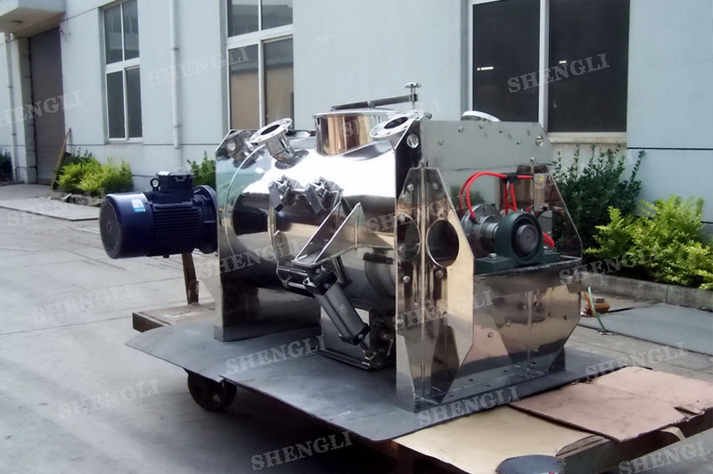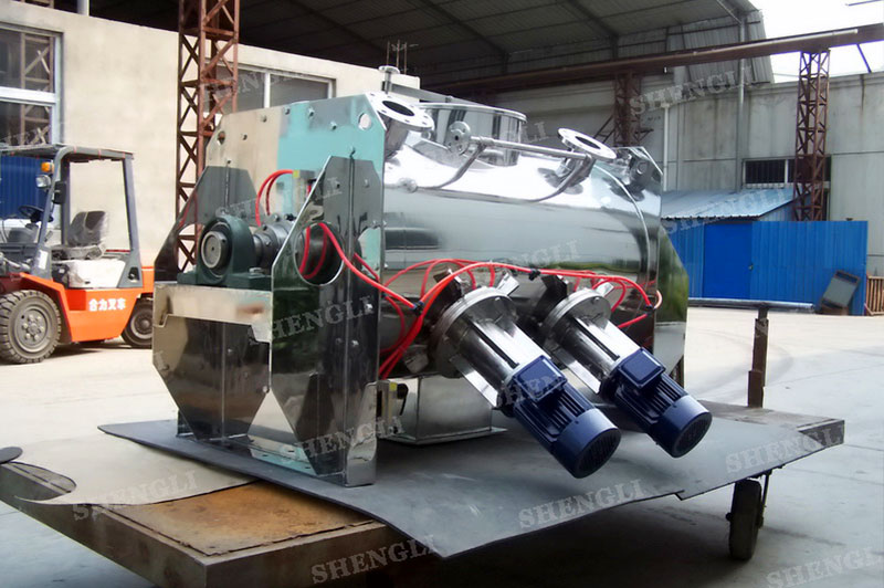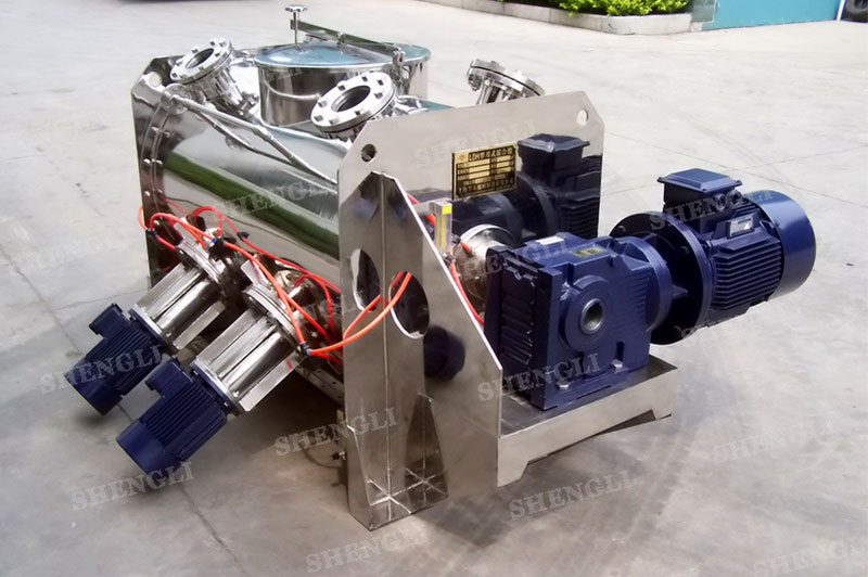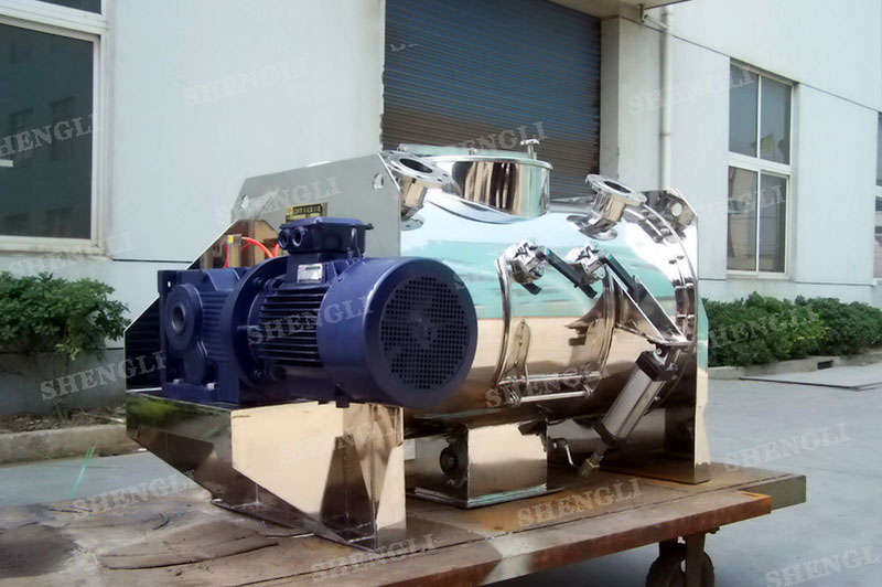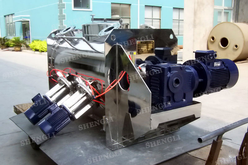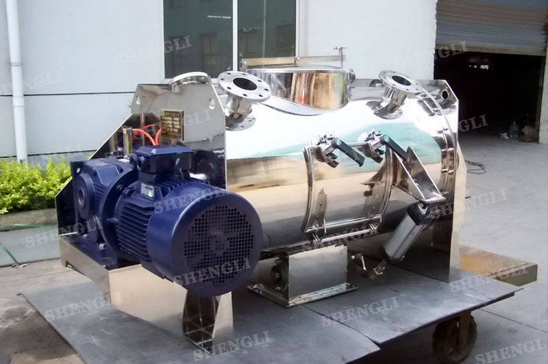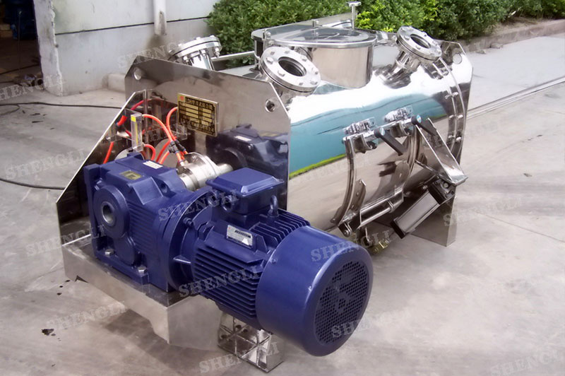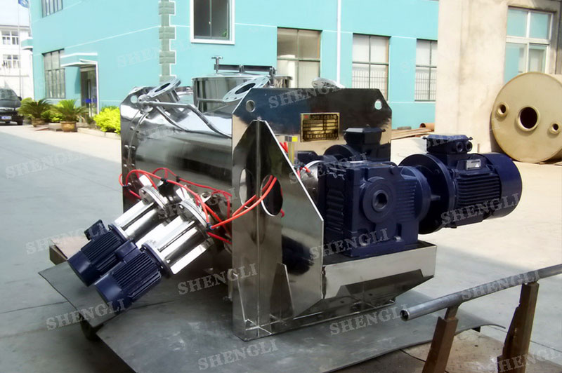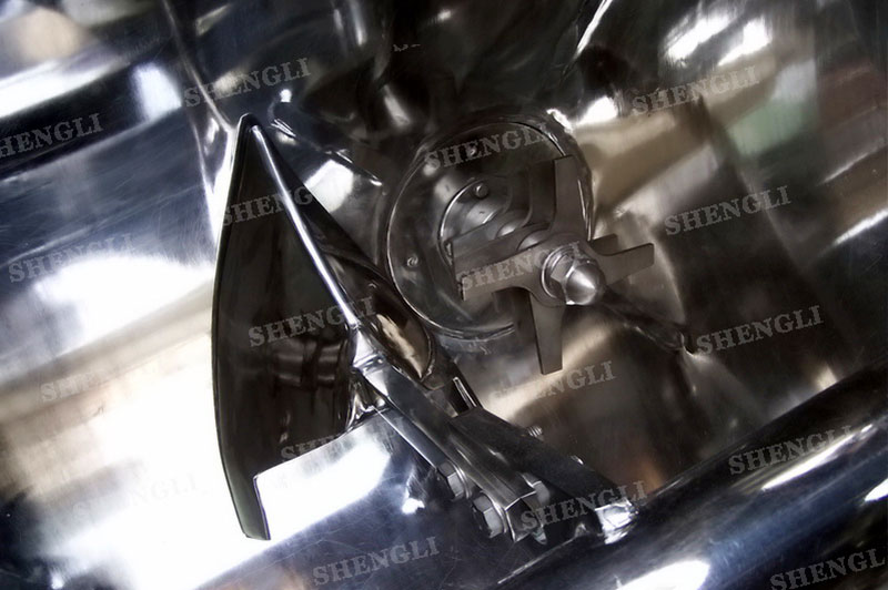 工作原理:犁刀混合機采用臥式圓柱筒體,內設平行主軸,主軸上安裝若干犁式刀頭,通過較快的旋轉速度,分割、重合物料,實現快速攪拌的功能,常結合1500-3000轉高速剪切飛刀相互作用。