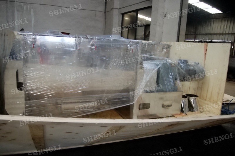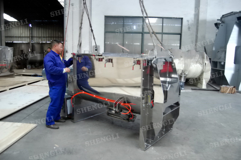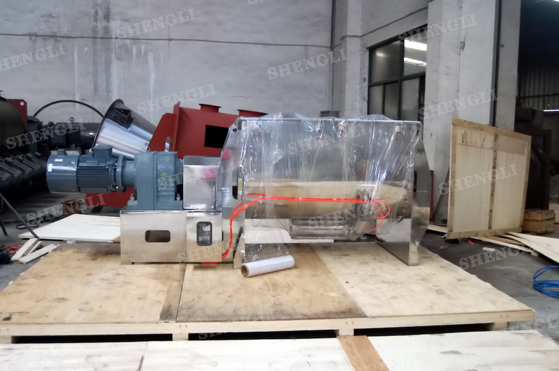 工作原理:螺帶式混合機采用U型筒體,內裝平行主軸,主軸上安裝正反雙向的盤條螺帶,不同維度螺帶分內螺帶與外螺帶,物料在螺帶的驅使下反復參混,能夠快速高效的混合。