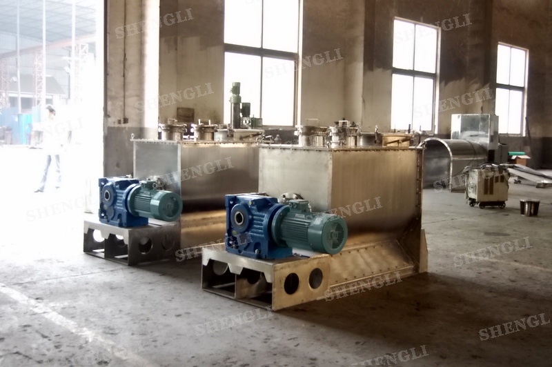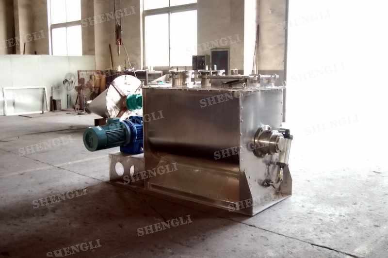 工作原理:螺帶式混合機采用U型筒體,內裝平行主軸,主軸上安裝正反雙向的盤條螺帶,不同維度螺帶分內螺帶與外螺帶,物料在螺帶的驅使下反復參混,能夠快速高效的混合。
