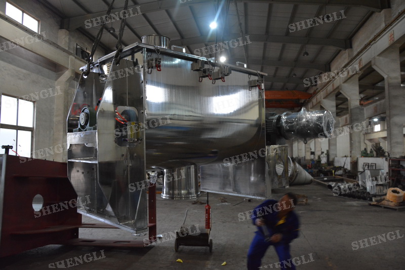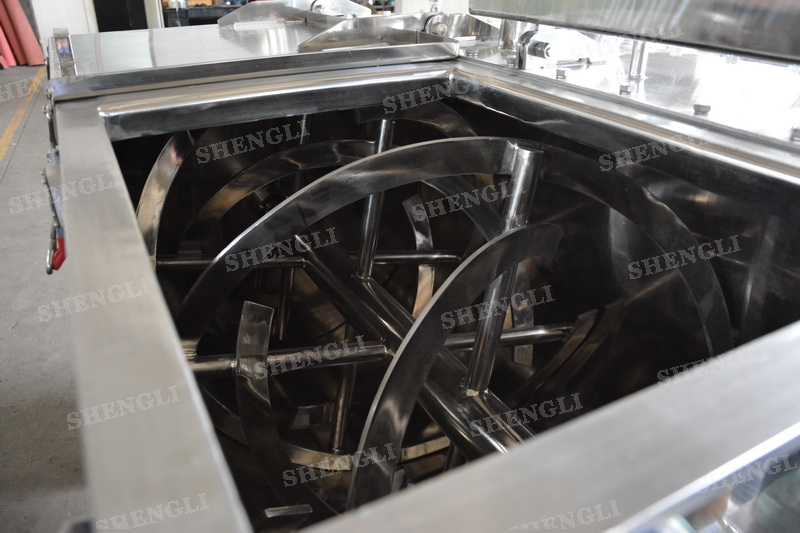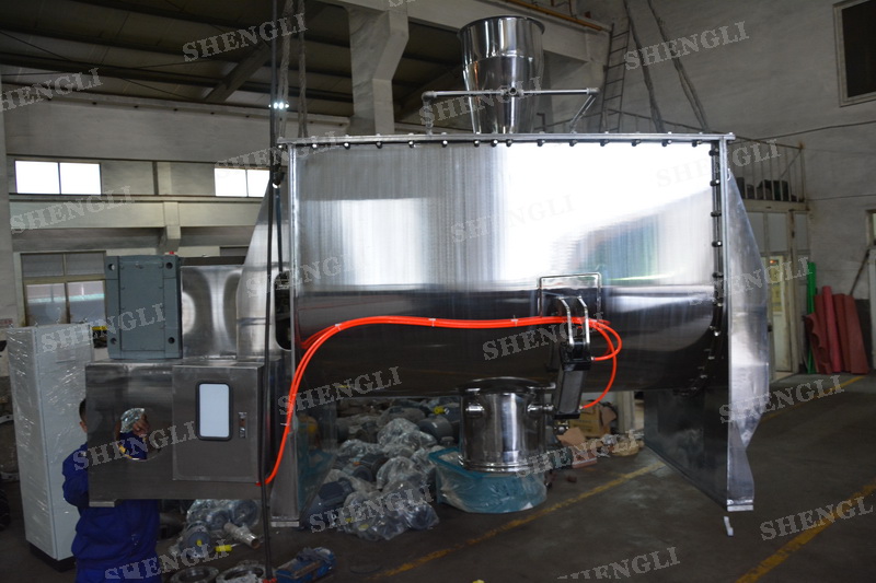 工作原理:螺帶式混合機采用U型筒體,內裝平行主軸,主軸上安裝正反雙向的盤條螺帶,不同維度螺帶分內螺帶與外螺帶,物料在螺帶的驅使下反復參混,能夠快速高效的混合。